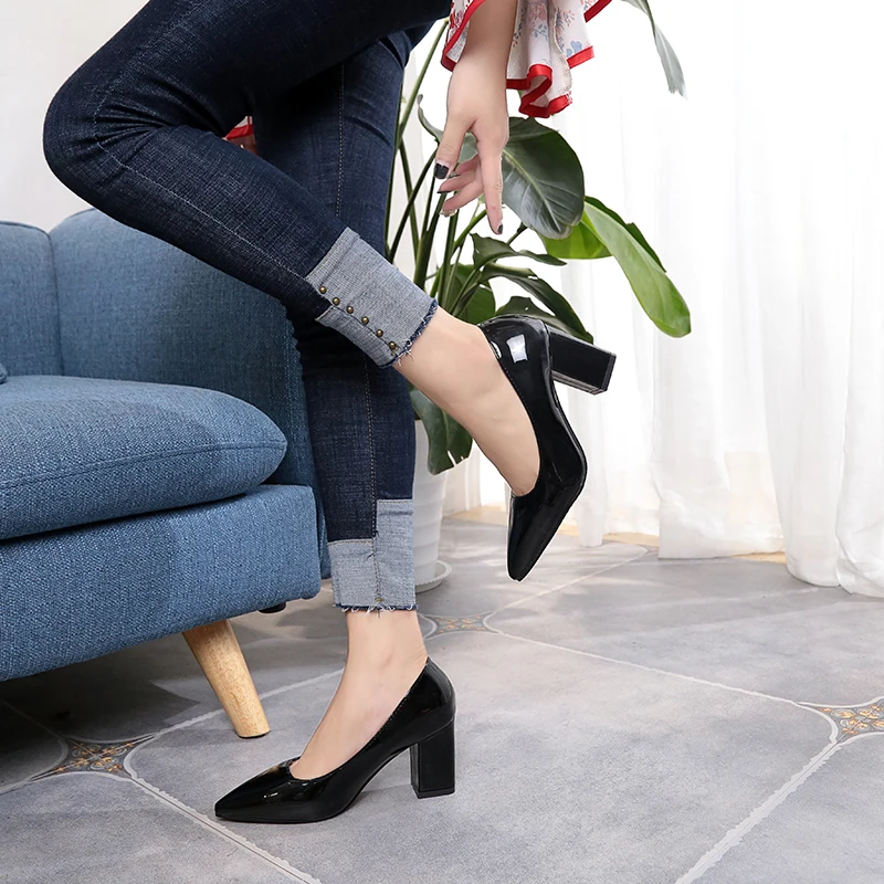 Aphixta-حذاء نسائي بكعب عالٍ من الجلد اللامع ، حذاء بمقدمة مدببة وكعب مربع عالي 7.5 سنتيمتر ، للحفلات والعمل ، باللون الأسود
