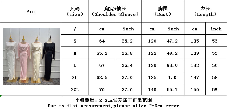 2XL: الصدر 140 سنتيمتر ، الظهر مع كم 70 سنتيمتر ، طول 150 سنتيمتر.