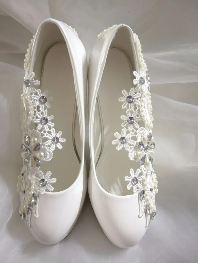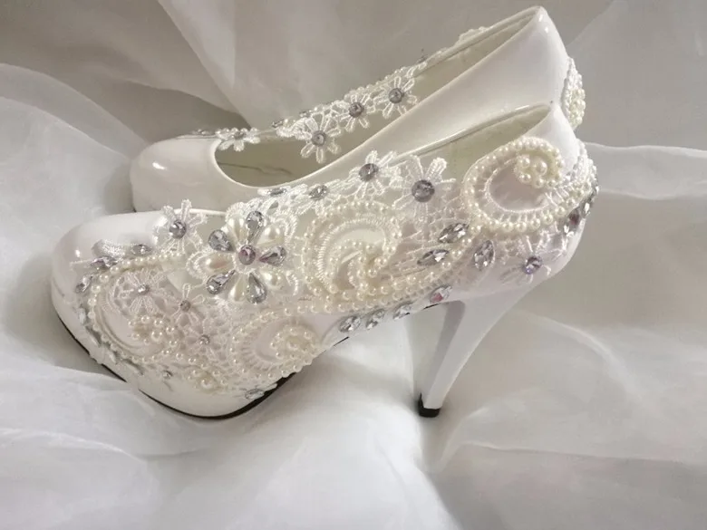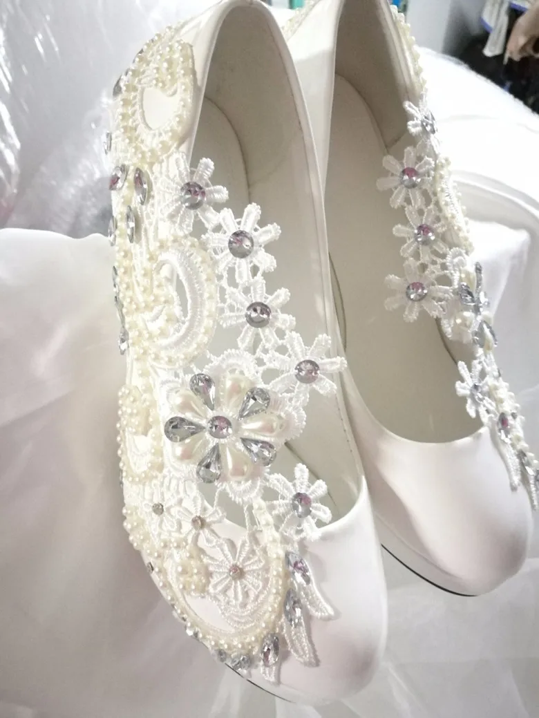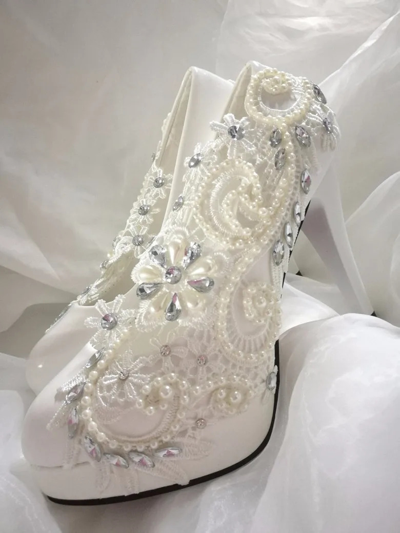 لحظات الحب جديد الدانتيل الأبيض حذاء الزفاف اليدوية النساء كعب حذاء امرأة بيضاء أحذية العروس العروس