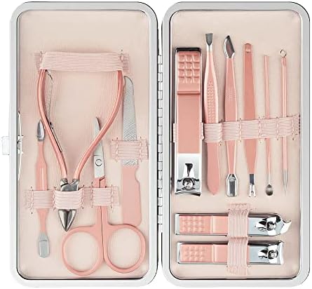 مجموعة العناية باظافر اليد، مقص زوائد اظافر القدم من الستانلس ستيل، مجموعة العناية باظافر القدم ومقلم اظافر، مجموعة مكونة من 12 قطعة، مجموعة عناية احترافية، مع شنطة سفر جلدية زهرية (لون زهري)