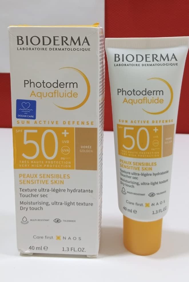 واقي من الشمس فوتوديرم ماكس اكوافلييد بعامل وقاية من اشعة الشمس بدرجة 50+ من بايوديرما، لون ذهبي مناسب لجميع انواع البشرة، 40 مل