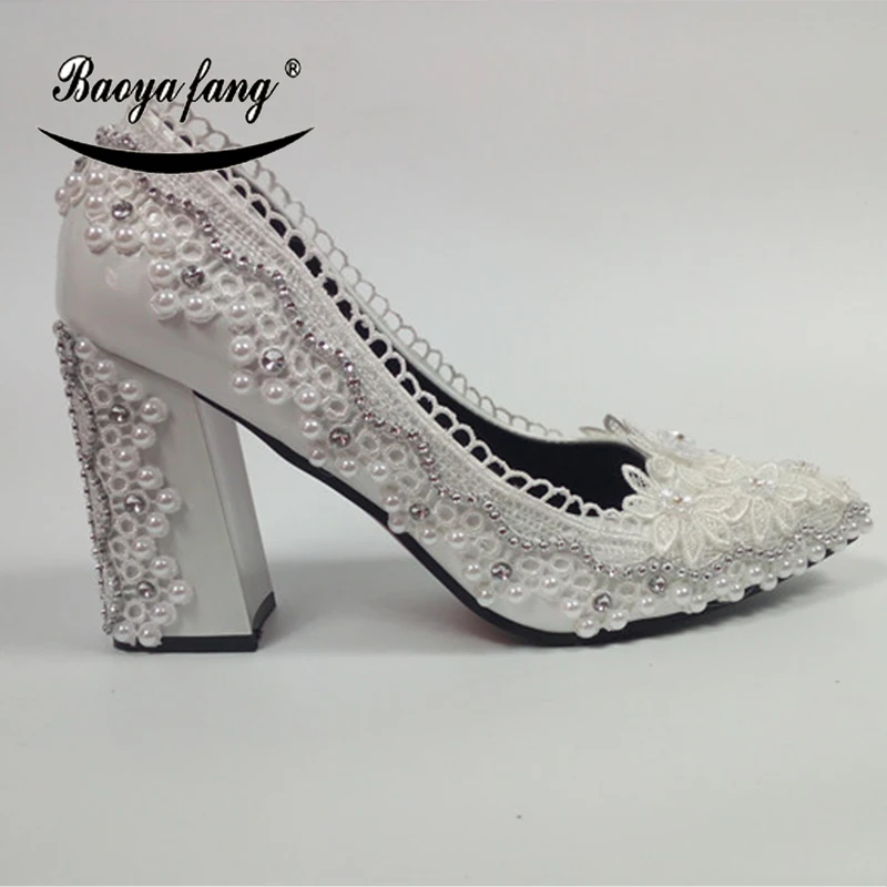 BaoYaFang-حذاء زفاف نسائي بكعب سميك ، حذاء بمقدمة مدببة مع حزام كاحل من الدانتيل الأبيض