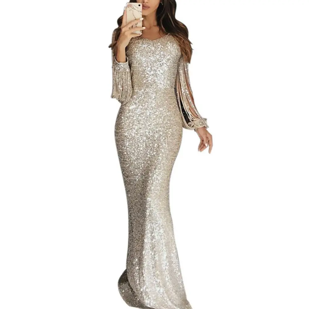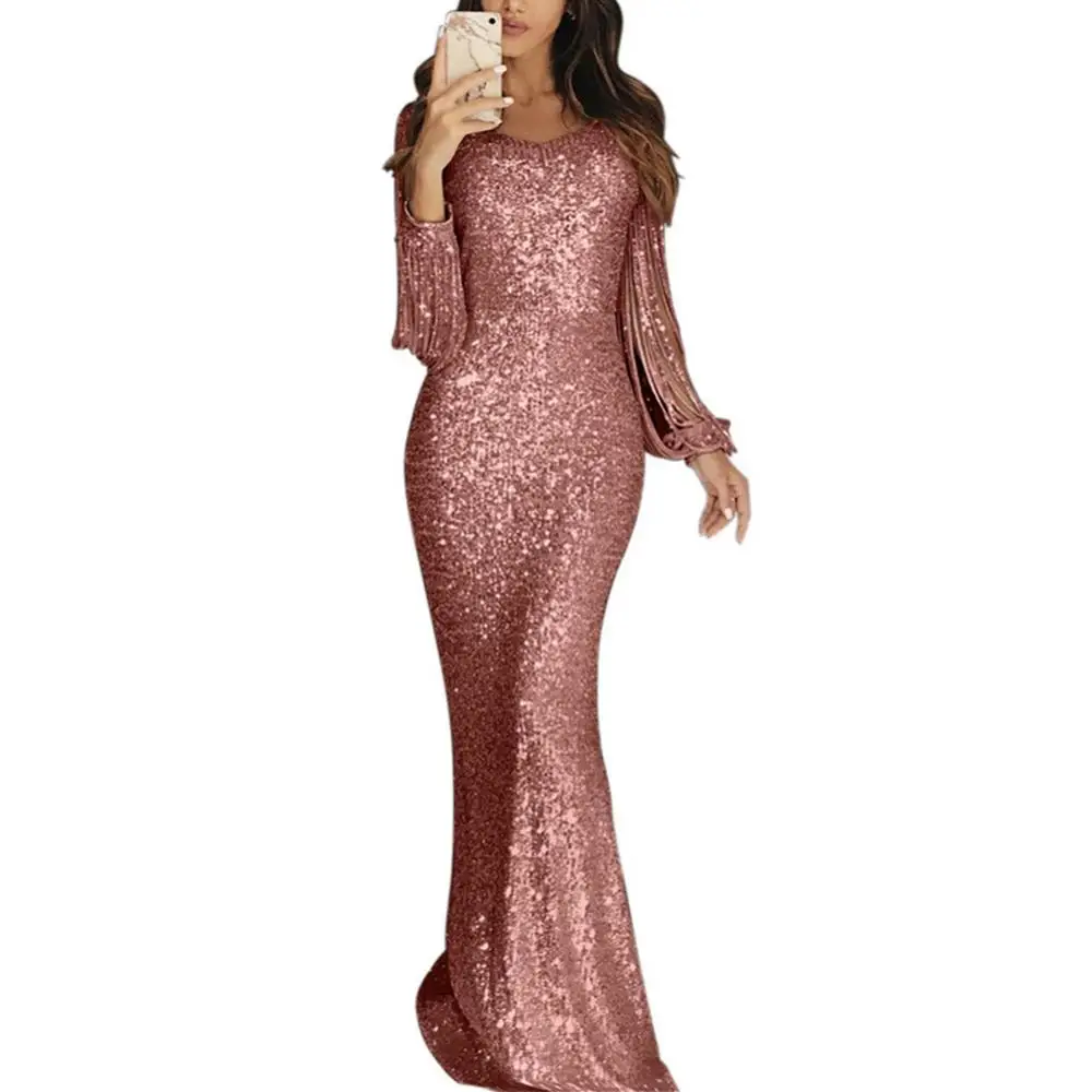 أنيقة السيدات Vestidos حجم كبير شيك المرأة شرابة فانوس كم مطرزة شرابة تتصدر الخامس الرقبة Bodycon فستان ماكسي للحفلات