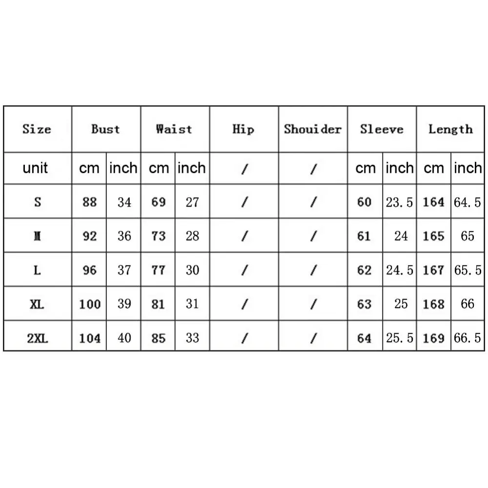 [لدينا حجم 2XL] التمثال: 104 سنتيمتر / 40 “، الخصر: 85 سنتيمتر / 33” ، الكم: 64 سنتيمتر / 25.5 “، الطول: 169 سنتيمتر / 66.5” (تقريبا.)