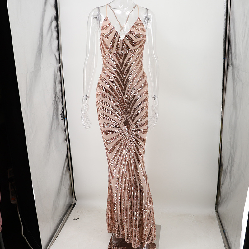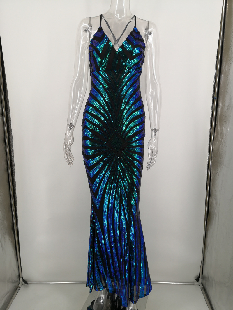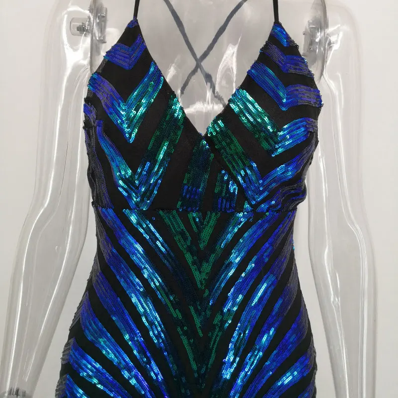 أنيقة عميقة الخامس الرقبة فساتين الحفلات الترتر ماكسي عارية الذراعين Bodycon مساء نادي حورية البحر فستان بكم طويل