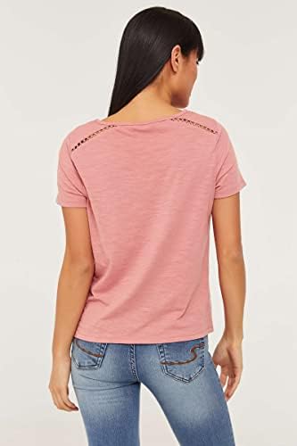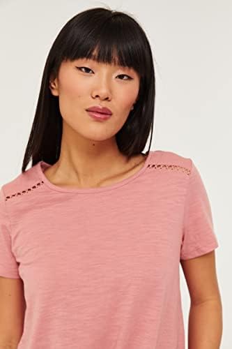 تي شيرت برقبة دائرية ضيقة. أكمام قصيرة مع حشوات كروشيه. حاشية معقودة. ترتدي العارضة مقاس S.