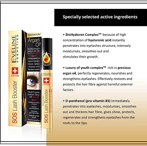 5 في 1 سيروم داعم للرموش اس او اس لاش من ايفلين كوزميتكس وهو منتج مبتكر يحدد الرموش ويحفز نموها ويضاعف حجمها. تعمل الصيغة المتطورة والغنية بالمكونات النشطة بالتعاون مع زيت الأرغان، وتظهر خصائص قوية للتغذية والتجديد. الاستخدام المنتظم للسيروم يجعل الرموش أكثر سمكاً وأطول وأقوى وأقل عرضة للسقوط. تم اختبار المنتج طبياً من قبل أطباء الجلدية. يتميز بيو هيالورون كومبليكس تي ام بمحتواه العالي من حمض الهيالورونيك، والذي يجعل المنتج يتغلغل على الفور في تراكيب الرموش، ويرطبها بشدة ويحفز نموها. ذا لوكسوري اوف يوث كومبليكس تي ام يرطب الرموش بشكل مثالي ويمنع تساقط الشعر. يقوم زيت الأرغان الثمين بتجديد الرموش بشكل مثالي، ويغذيها ويقويها من الجذور وحتى الأطراف. لا يحتوي المنتج على عطور ويوصى به أيضاً للأشخاص مرتدي العدسات اللاصقة.