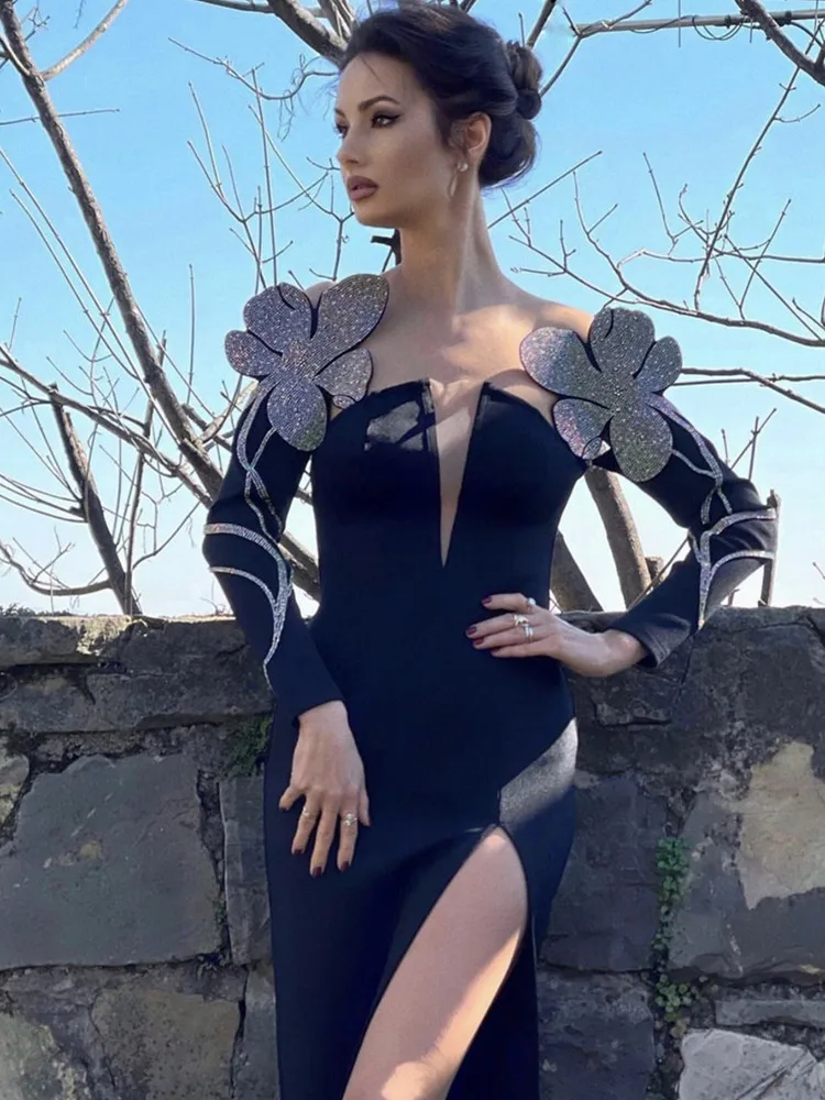 فستان جذاب مكشوف الظهرين للنساء طويل منقسم باللون الأسود والكريستال بتصميم جذاب ومزين بأشرطة لامعة موديل 2022 فستان أنيق للحفلات والنوادي المسائية