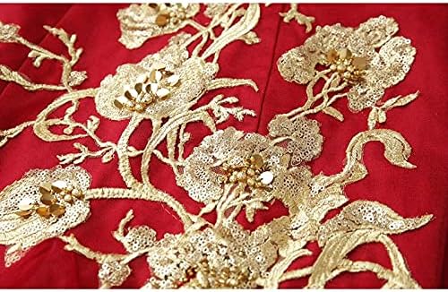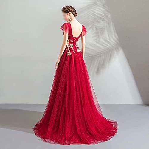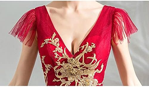 فستان سهرة خفيف بفتحة رقبة على شكل الحرف V واقامة طائرة وذيل صغير ، مطرز ذهبي على شكل زهور ، مناسبات وحفلات الكوكتيل والزفاف والحفلات المسائية