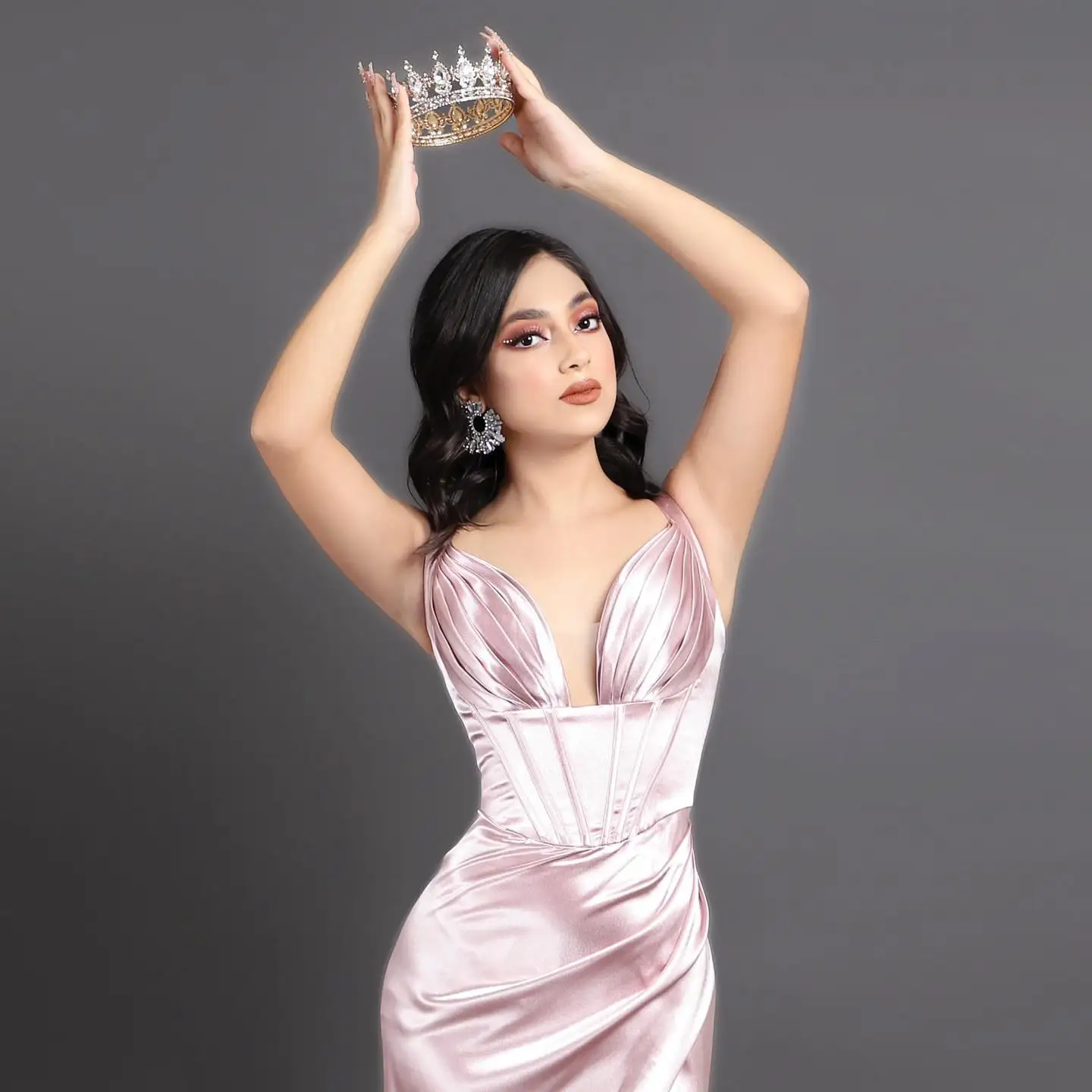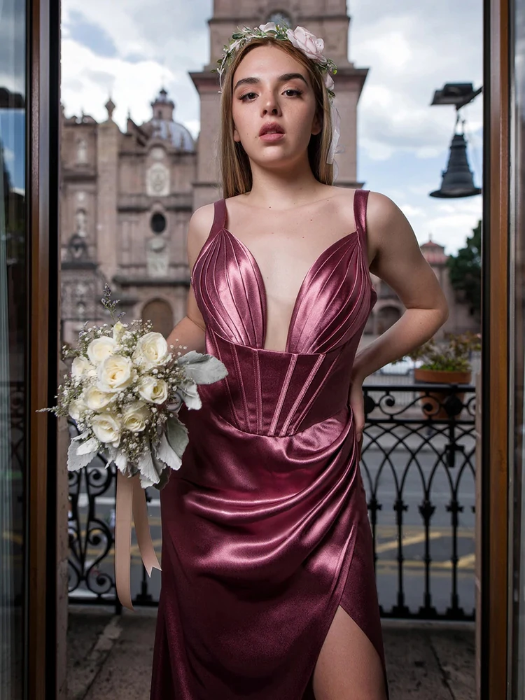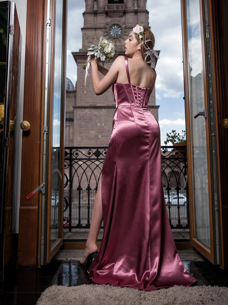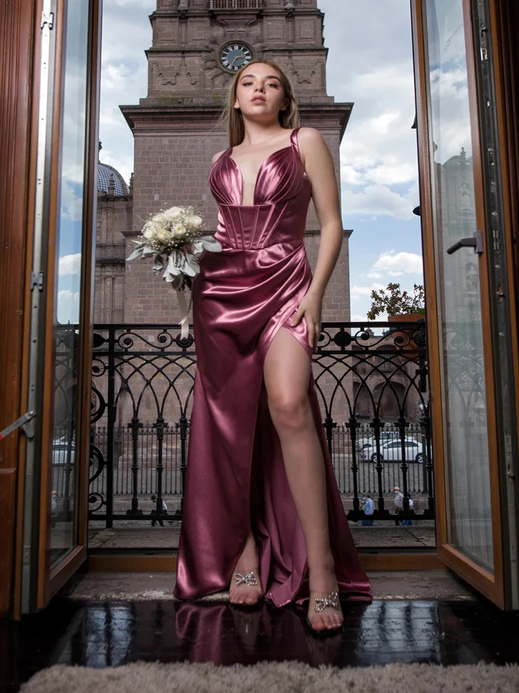 فستان صيفي طويل أحمر بدون أكمام بطول حرف v مصنوع من الساتان ذو ثنيات على شكل عظمة السمكة ذو جودة عالية فستان مسائي سادة سادة