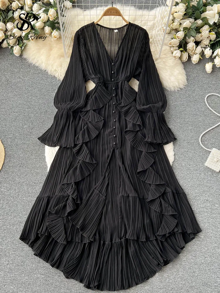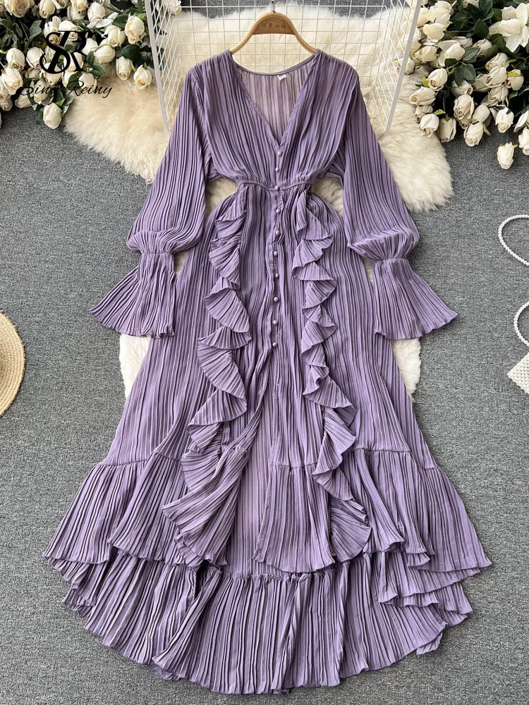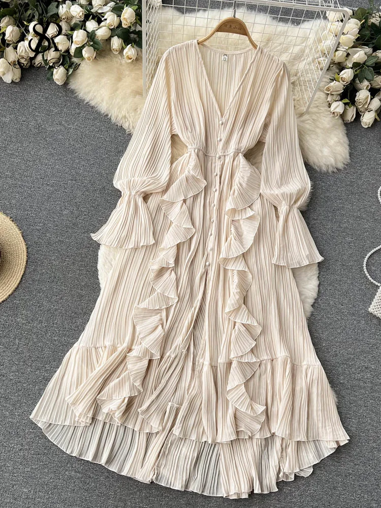 فستان طويل للشاطئ بوهيمي موضة صيف 2022 للسيدات مكشكش بأكمام طويلة وفتحة رقبة شكل V أنيق بخصر مطاطي وفساتين للشاطئ