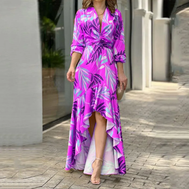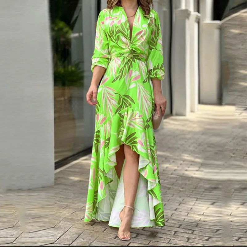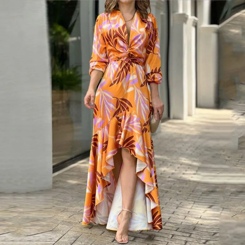 فستان نسائي طويل من Ellafads للخريف أنيق جذاب بياقة على شكل V ومطبوع بأكمام طويلة وحفلات غير منتظمة فساتين الحفلات والسهرات