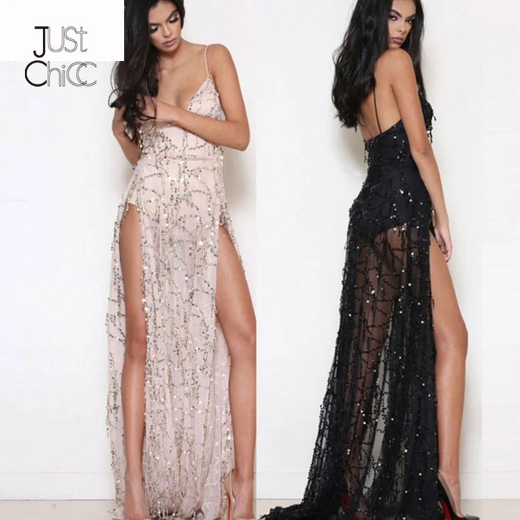 Justchicc فستان طويل أنيق مزين بالترتر شبكي فستان طويل أنيق للنساء فضفاض فضفاض ورقبة على شكل V فستان مثير للحفلات
