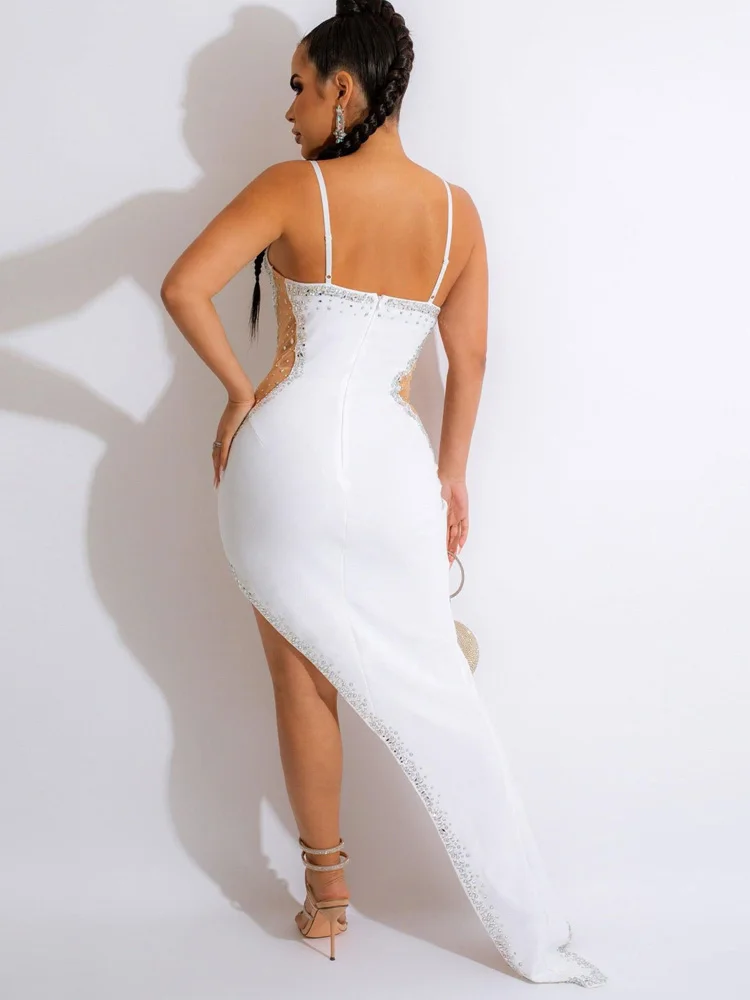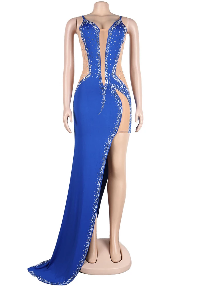 Kricessee مثير الأزرق شبكة كريستال المرقعة فستان ماكسي المرأة حزام انظر من خلال Bodycon كلوبوير فستان طويل