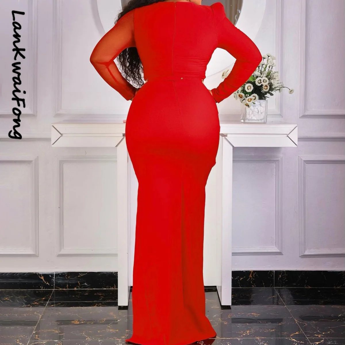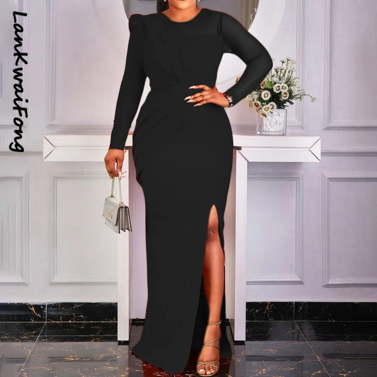 LKF الربيع أنيقة المرأة اللباس شبكة لصق الصلبة سبليت اللباس 3XL اللباس ضئيلة مثير عارضة اللباس زيبر جولة الرقبة تراكب