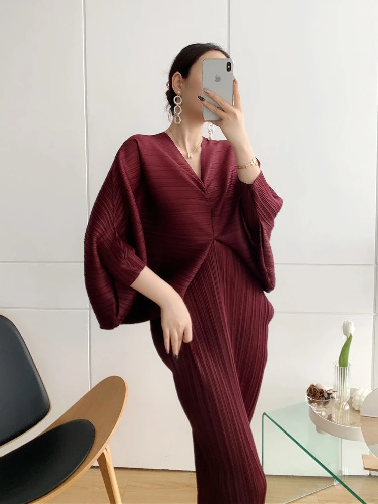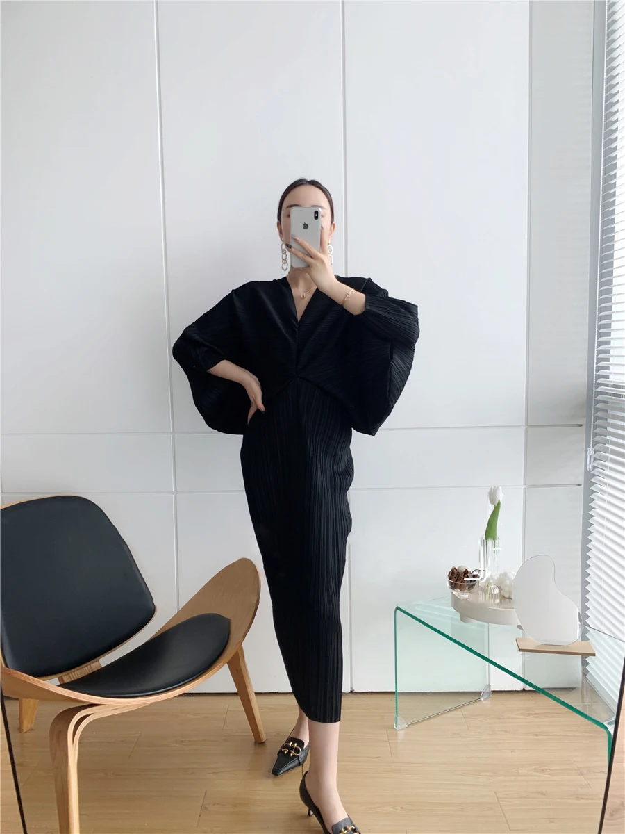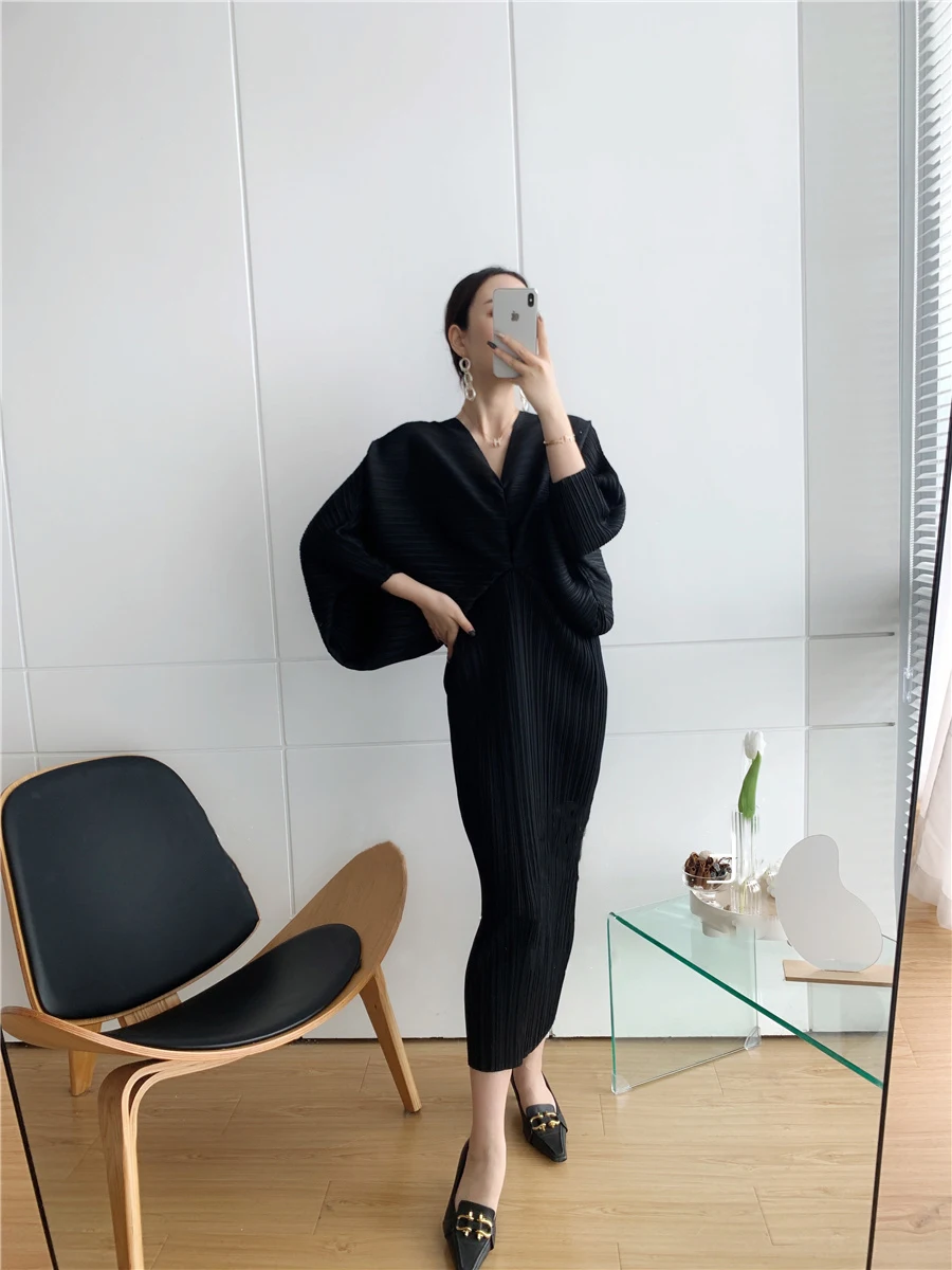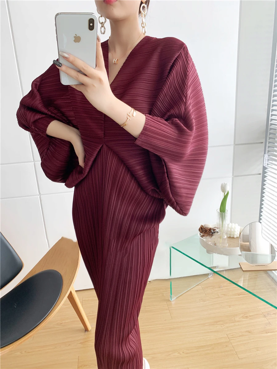 Miyake مطوي فستان طويل 2022 الربيع الصيف الإناث أنيقة الخفافيش كم الخامس فساتين السهرة من النساء مصمم ملابس عصرية