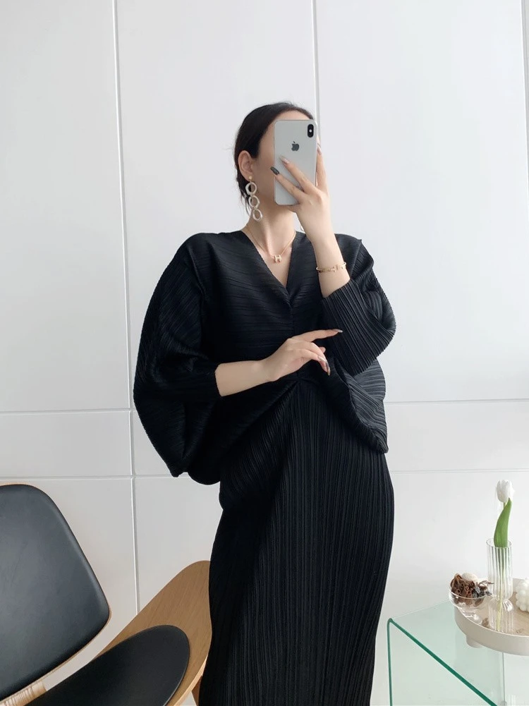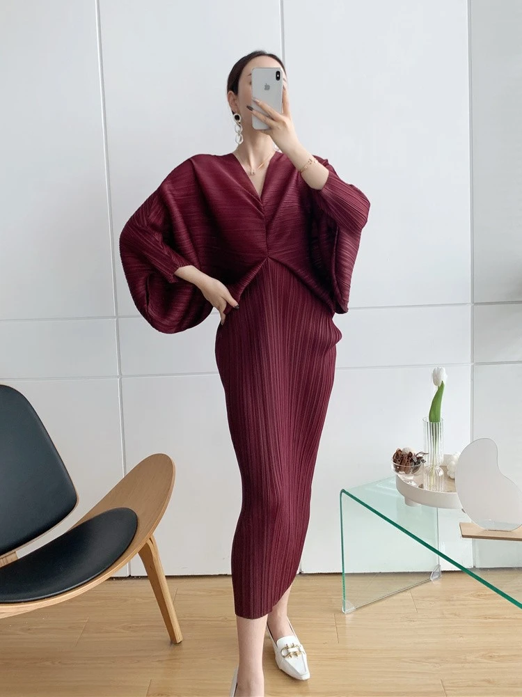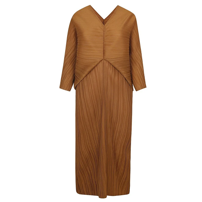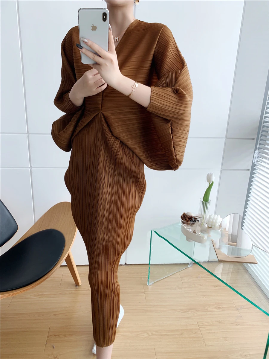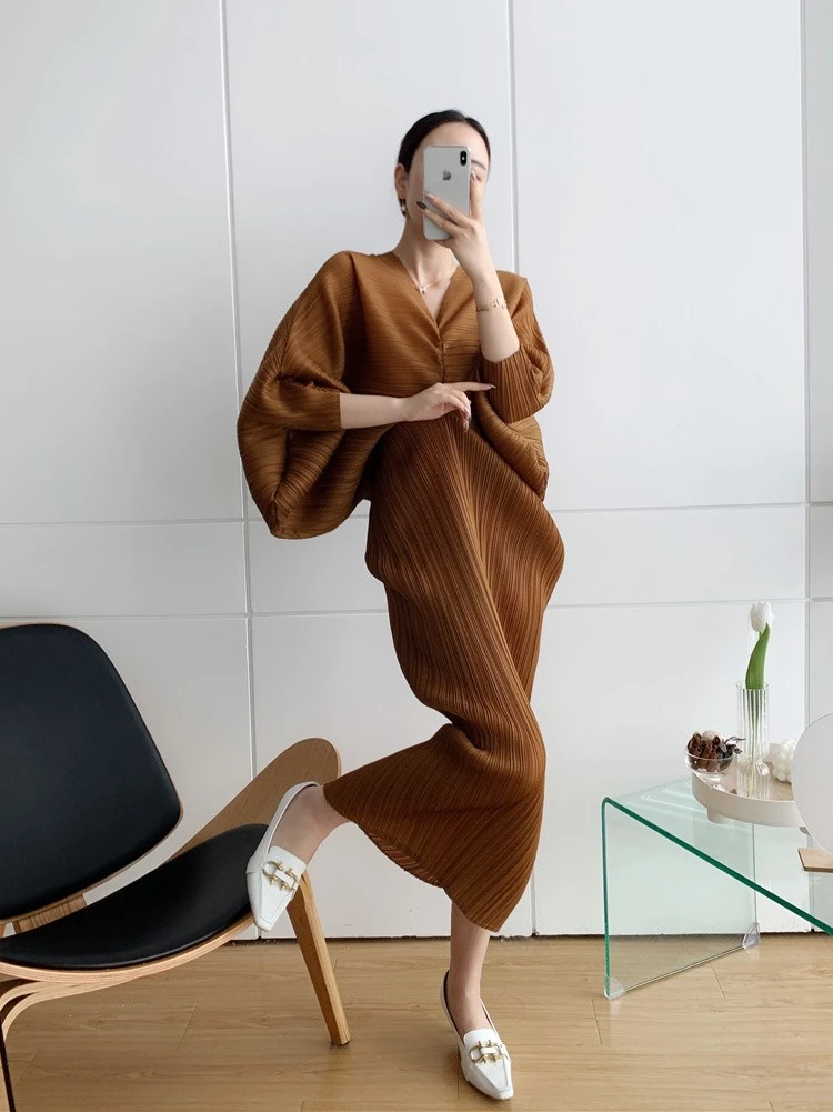 Miyake مطوي فستان طويل 2022 الربيع الصيف الإناث أنيقة الخفافيش كم الخامس فساتين السهرة من النساء مصمم ملابس عصرية