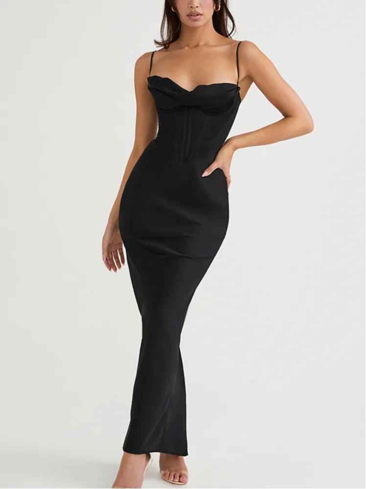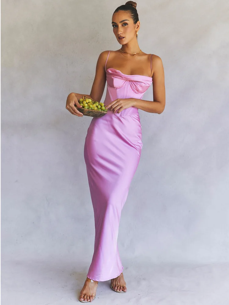 Mozision الساتان عارية الذراعين فستان ماكسي للنساء موضة السباغيتي حزام أكمام طويلة فستان طويل Vestido