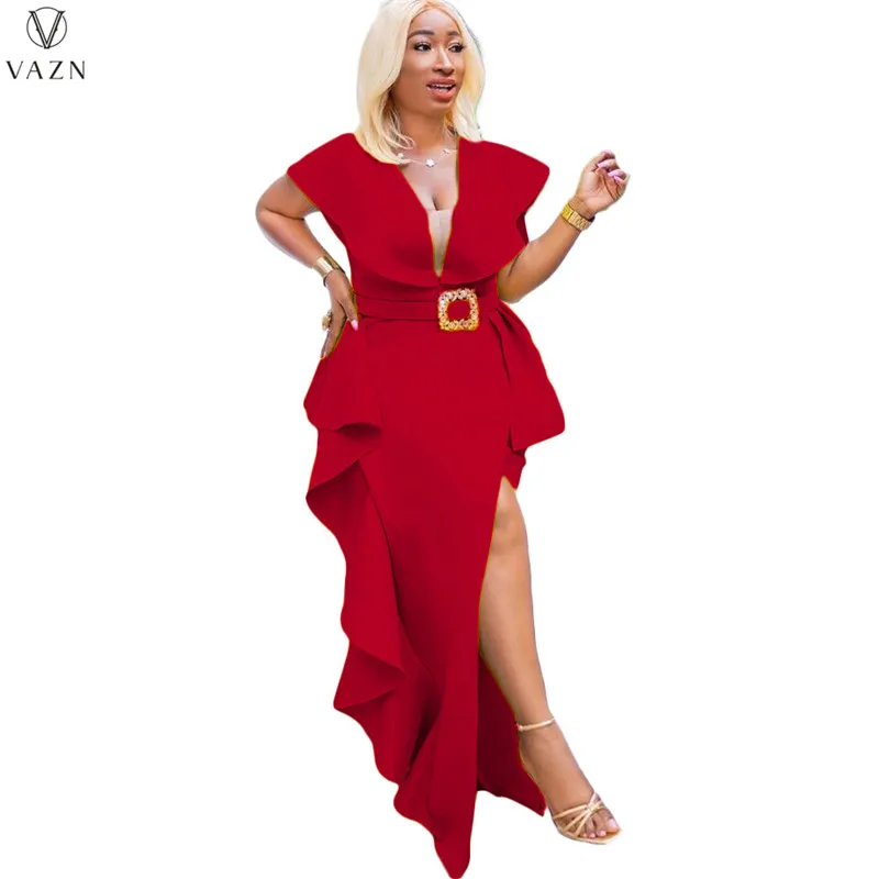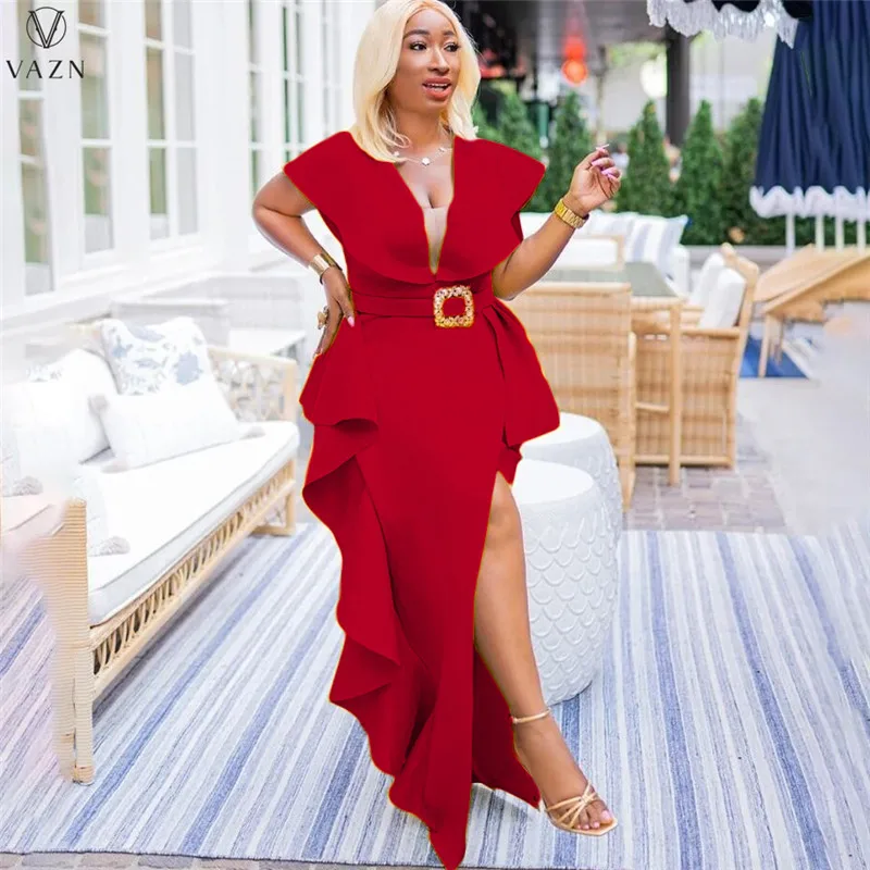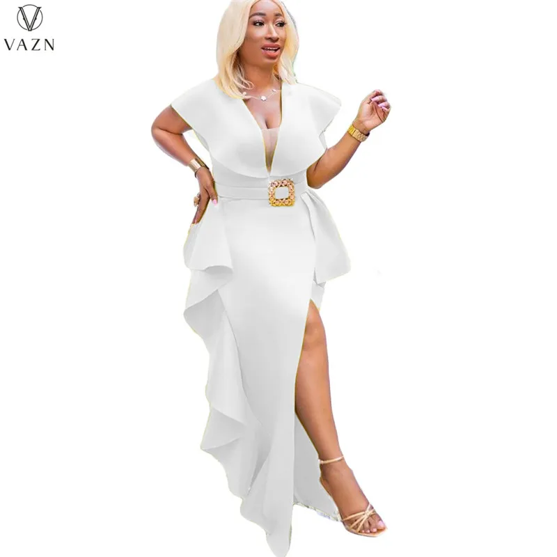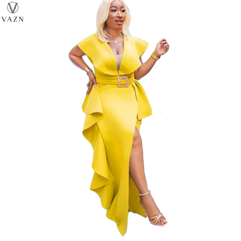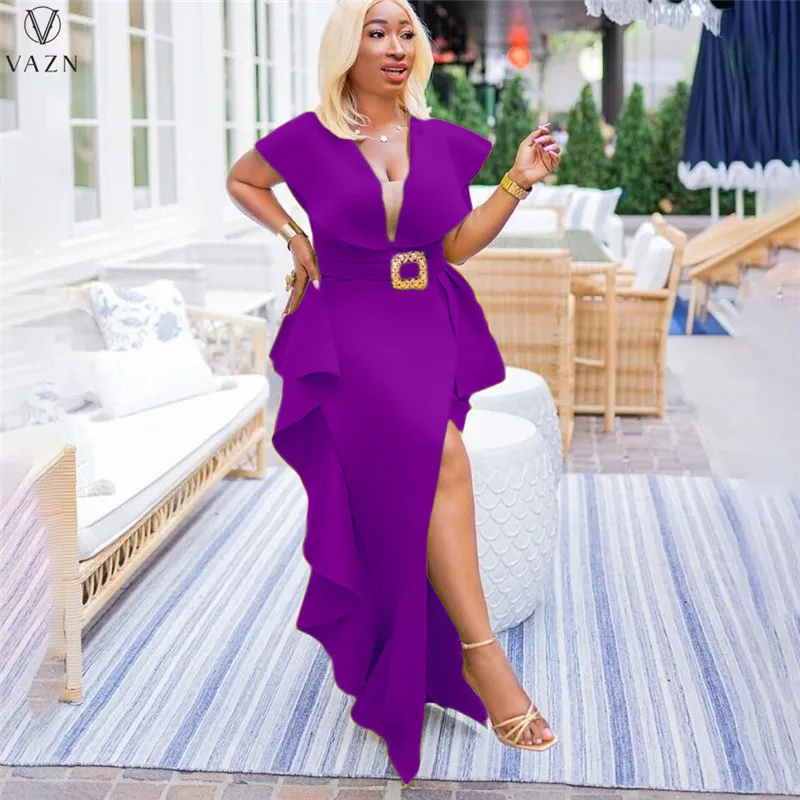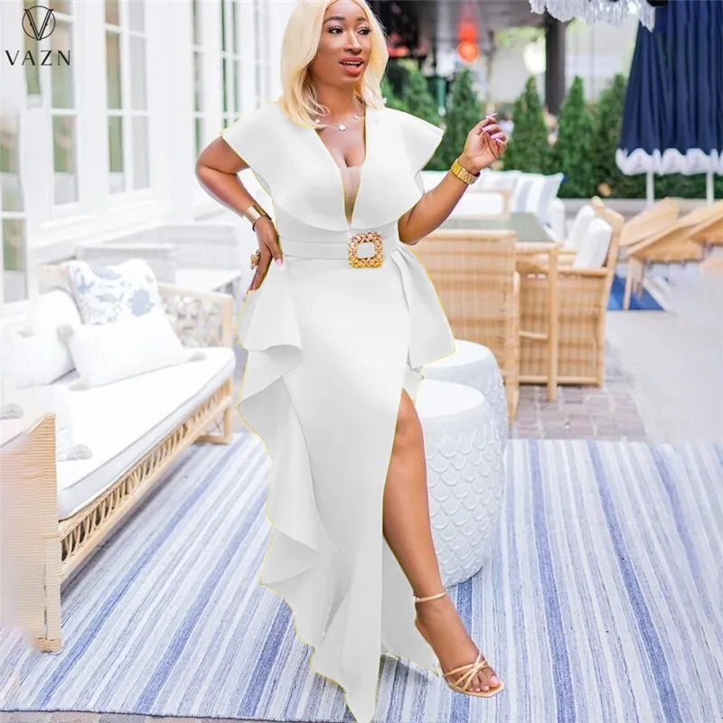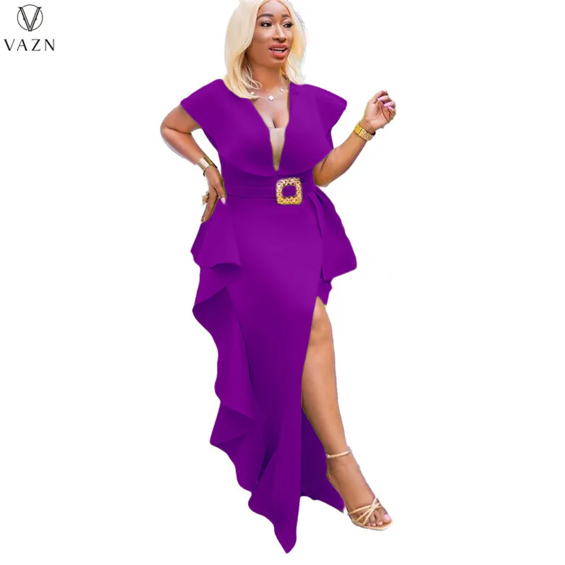 VAZN جديد 2021 السيدات موضة شارع العليا فستان طويل كم قصير نمط الخامس فستان لون نقي النظامية الطابق فستان طويل